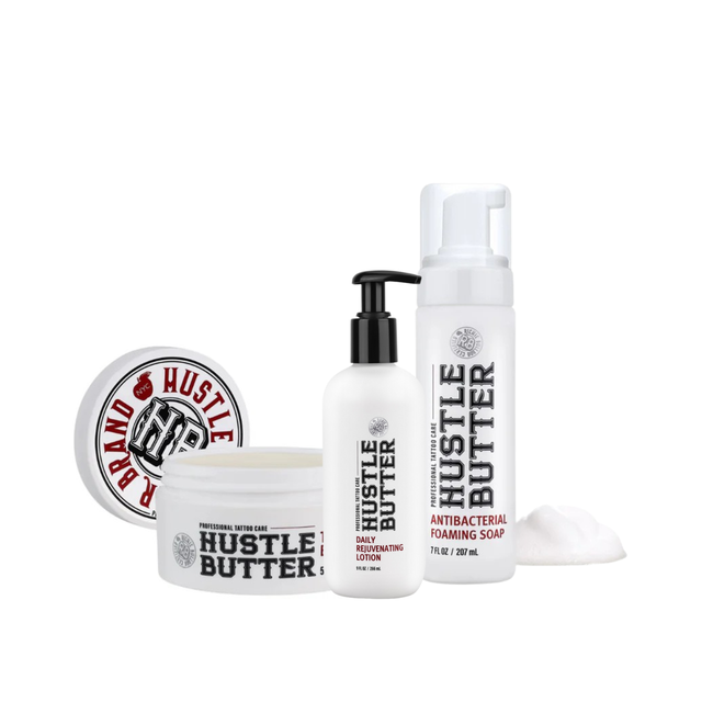 The 5oz Hustle Butter Aftercare Cream locks in moisture and protects your new piece with premium conditioning, promoting fast, healthy healing. The Hustle Butter Daily Lotion keeps your skin hydrated and your tattoo vibrant long after the needle stops buzzing. Completing the set is the Hustle Foamer, a gentle yet effective wash that cleanses your tattoo without stripping essential oils or causing irritation.