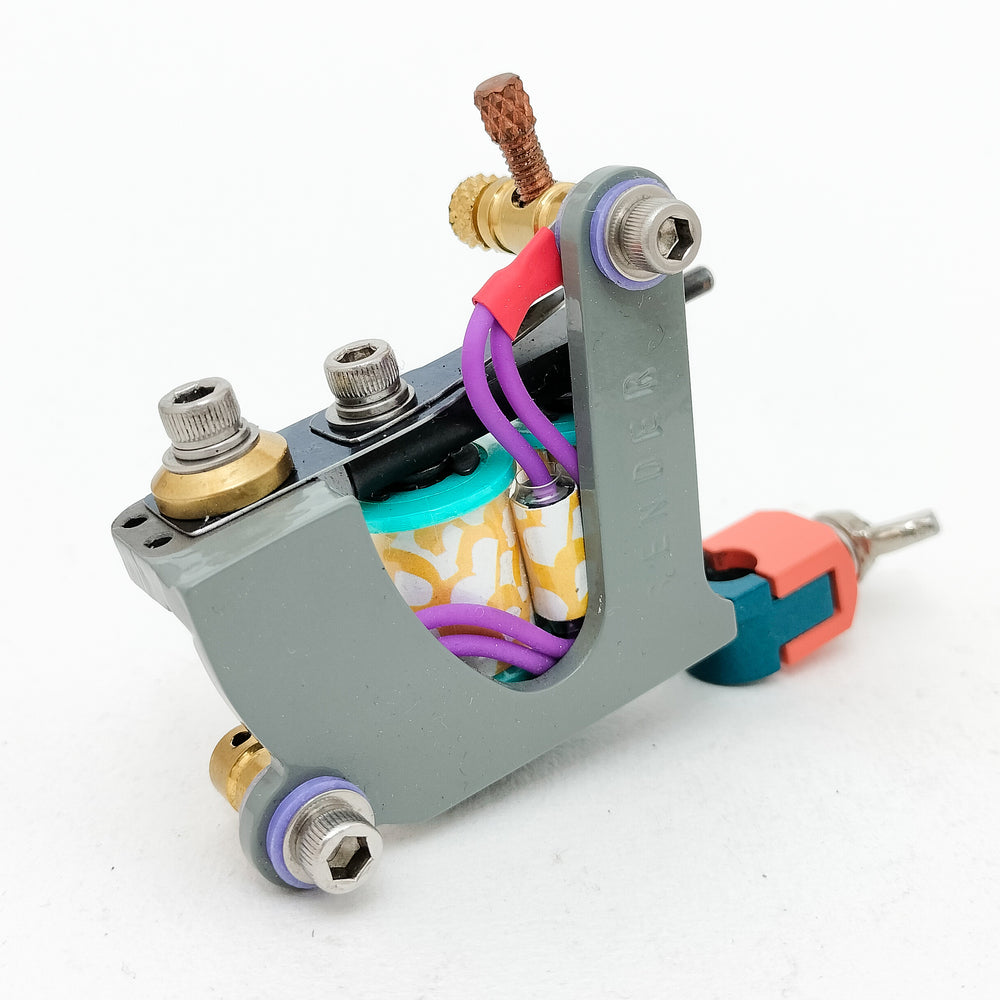 This grey, teal and salmon zippy fine liner runs quick with a sharp hit and a consistent drive for pushing 1-tight 7 liners. It runs around 130hz loaded and will be a nice, controlled fine liner for medium to fast hand speeds. It should make your fine lines tight, solid and easier than ever.