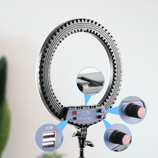 18 inch Ring light and tripod with device holder and 2 x USB charging ports.