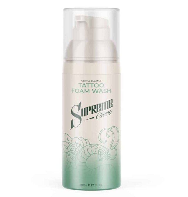 Supreme Creme Tattoo Foam Wash is a gentle cleansing liquid foam soap designed for use during the tattoo procedure and also for tattoo aftercare. The formula is antiseptic and can be used before, during and after the tattoo procedure.
